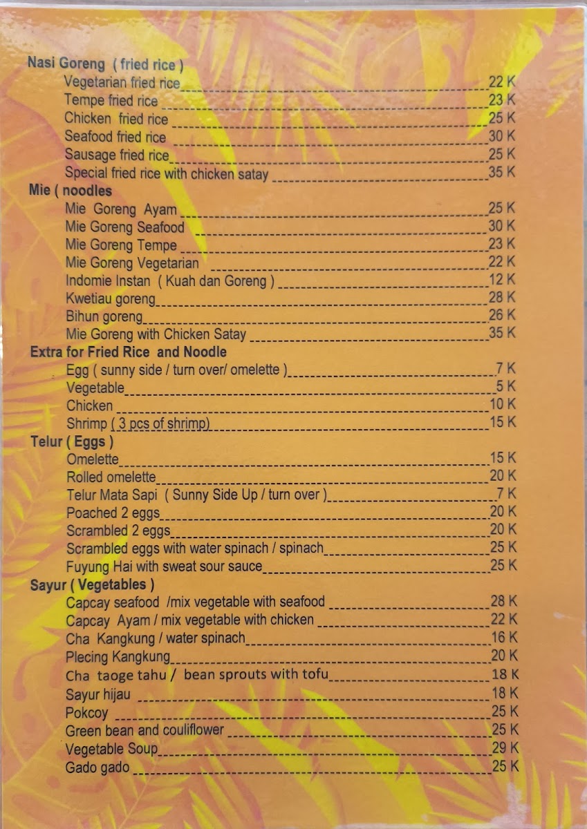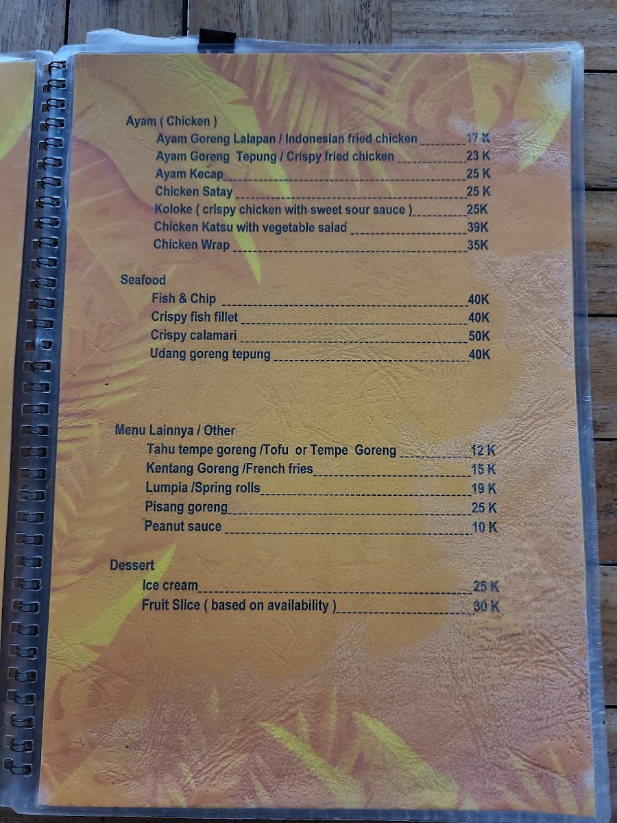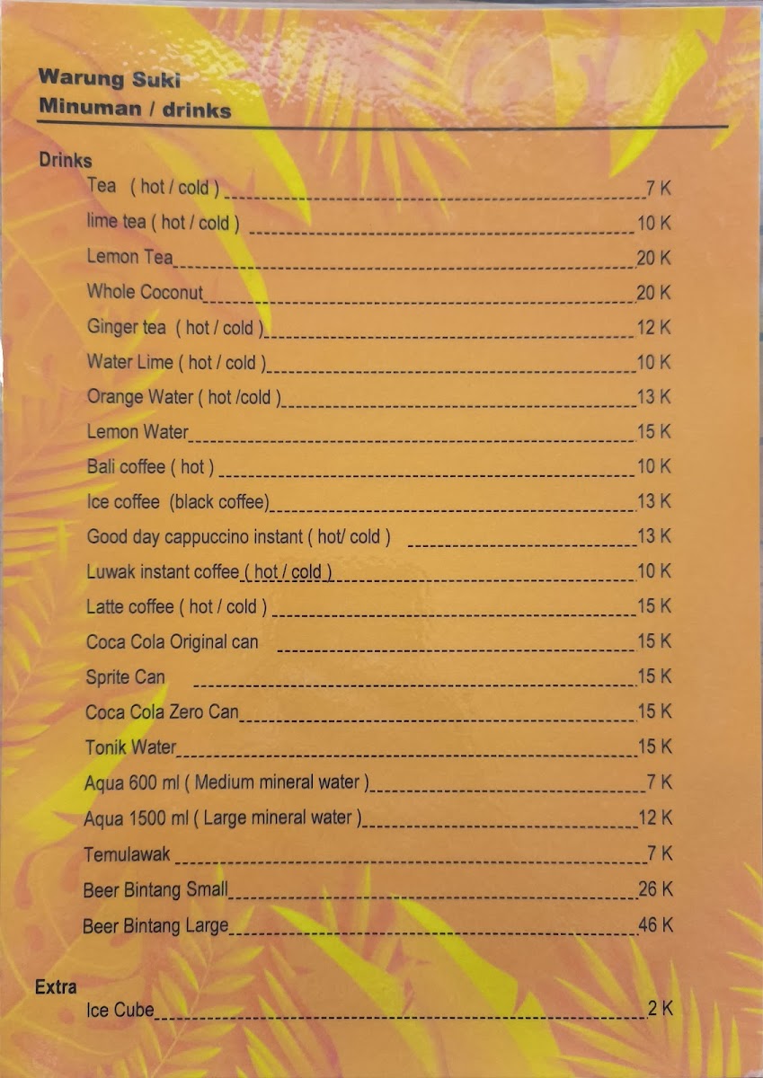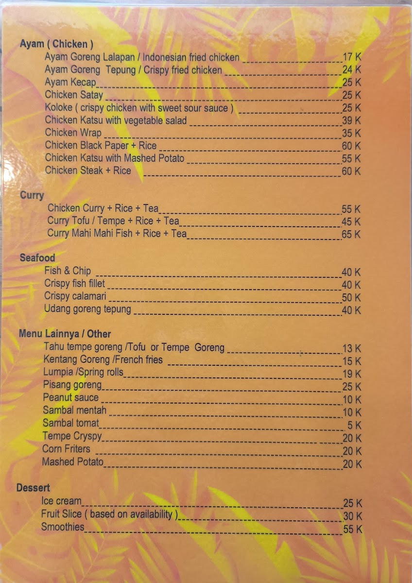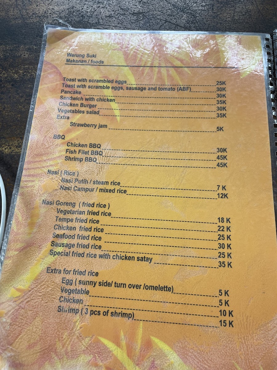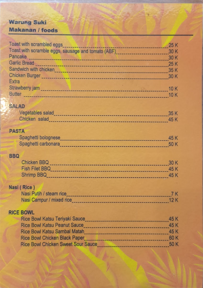 Warung Suki offers a delightful array of authentic Indonesian dishes, perfect for anyone craving the rich flavors of Bali. The menu highlights both traditional and comforting options that cater to a variety of tastes. A standout dessert is the Banana Pancake, which pairs perfectly with its sweet and soft texture, ideal for those with a sweet tooth. For a savory main, the Ayam Goreng Lalapan impresses with crispy fried chicken served alongside fresh, crunchy vegetables. Vegetarians will love the Pisang Rai, a simple yet delicious dish made with bananas wrapped in rice flour and served with grated coconut. The noodles also shine at Warung Suki with the Mio Goreng Mio Es Noodles Y Telar Dapar Creo Que Era Tortilla, offering a unique combination of flavors that balances richness with freshness. For a satisfying meal, the Nasi Campur 15 K offers a complete plate with a mix of rice and various tasty sides, all for an affordable price. Lastly, the crispy Tahu Tempe Goreng is a must-try for fans of tofu and tempeh, fried to perfection and served as a hearty snack or side. The menu at Warung Suki brings together flavors that reflect the culinary traditions of Bali, making it a perfect spot for a memorable dining experience.